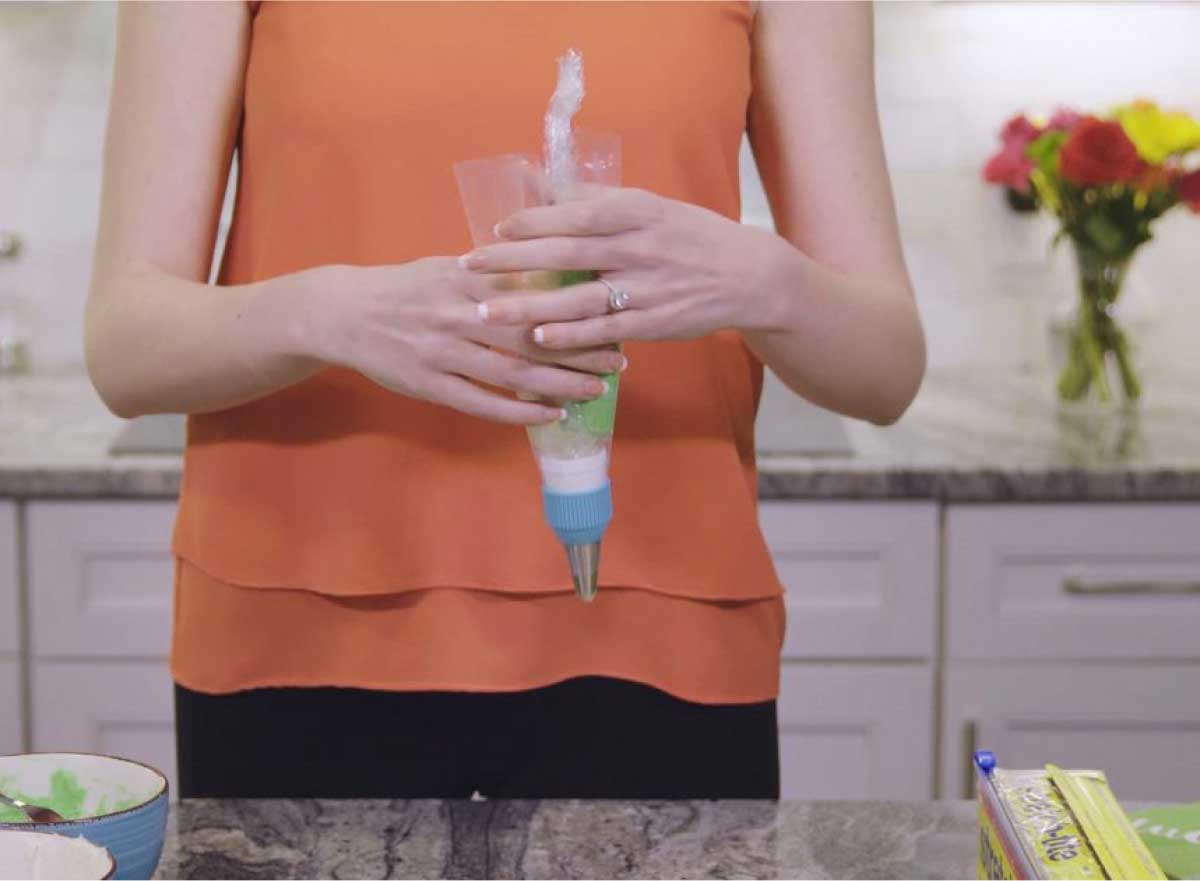To make a piping bag for frosting, lay out a piece of stretch-tite, put icing in the center, and roll it up. This is a great trick for creating multicolor frosting!